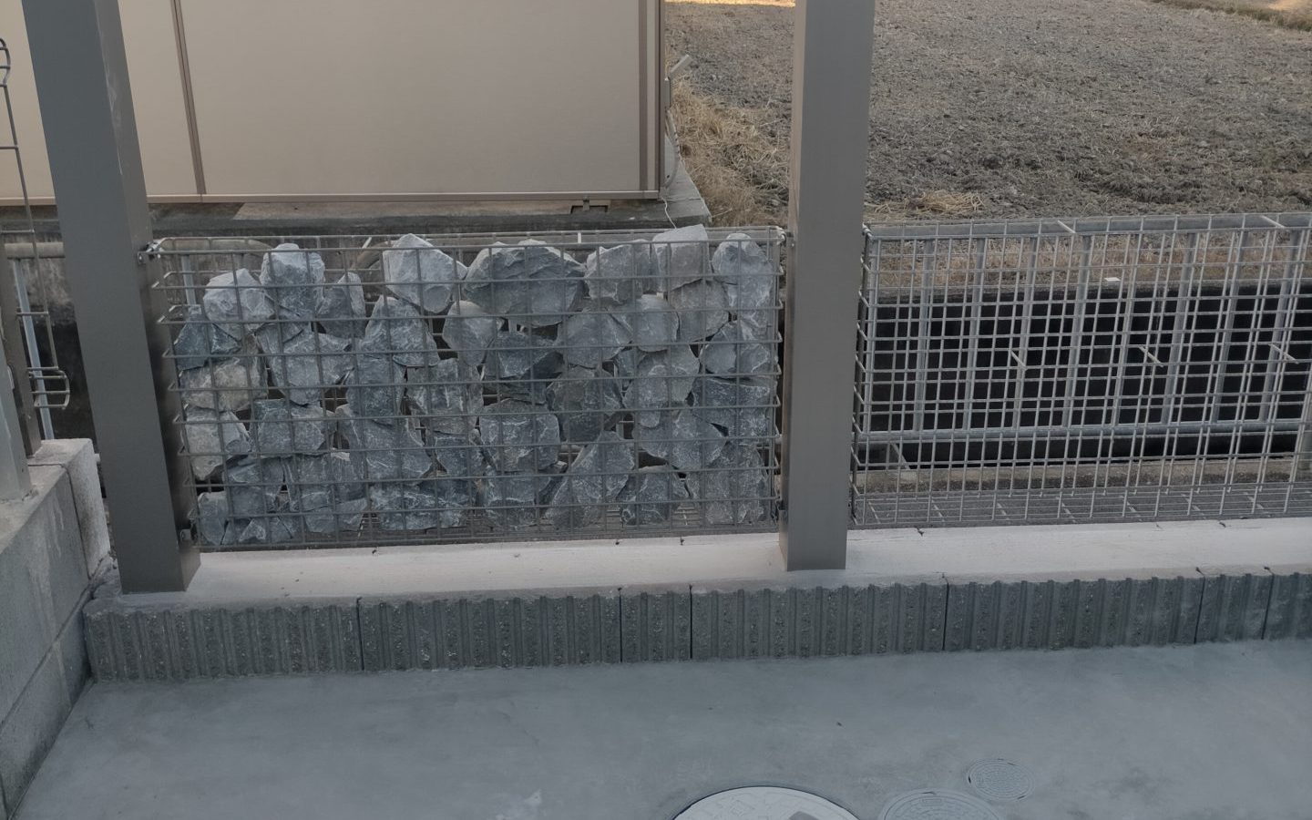 普通のガビオンは厚みもありその間に石をぎゅうぎゅうにつめるので後ろが見えるということはないのですが、今回は奥行きがなかったため石が重ねられず若干隙間はできてしまいました。