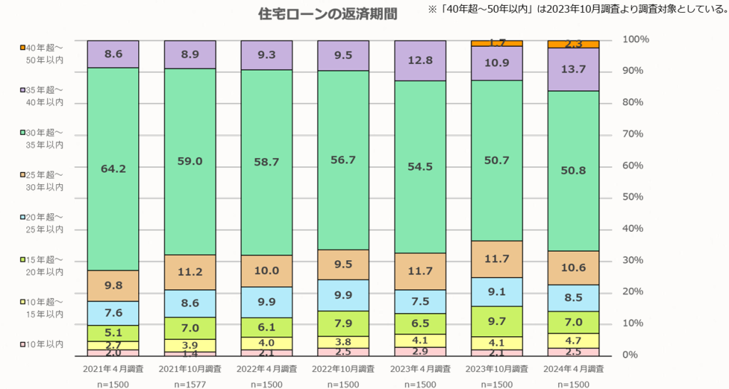 住宅金融支援機構「住宅ローンの返済期間」によると割合が最も高い返済期間は「30年~35年」であることがわかります。
