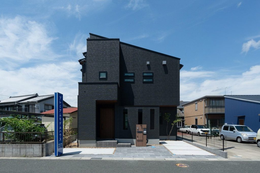 ダークグレーのレンガ調サイディングを全面に使用し、重厚感とクールな印象を演出しています。