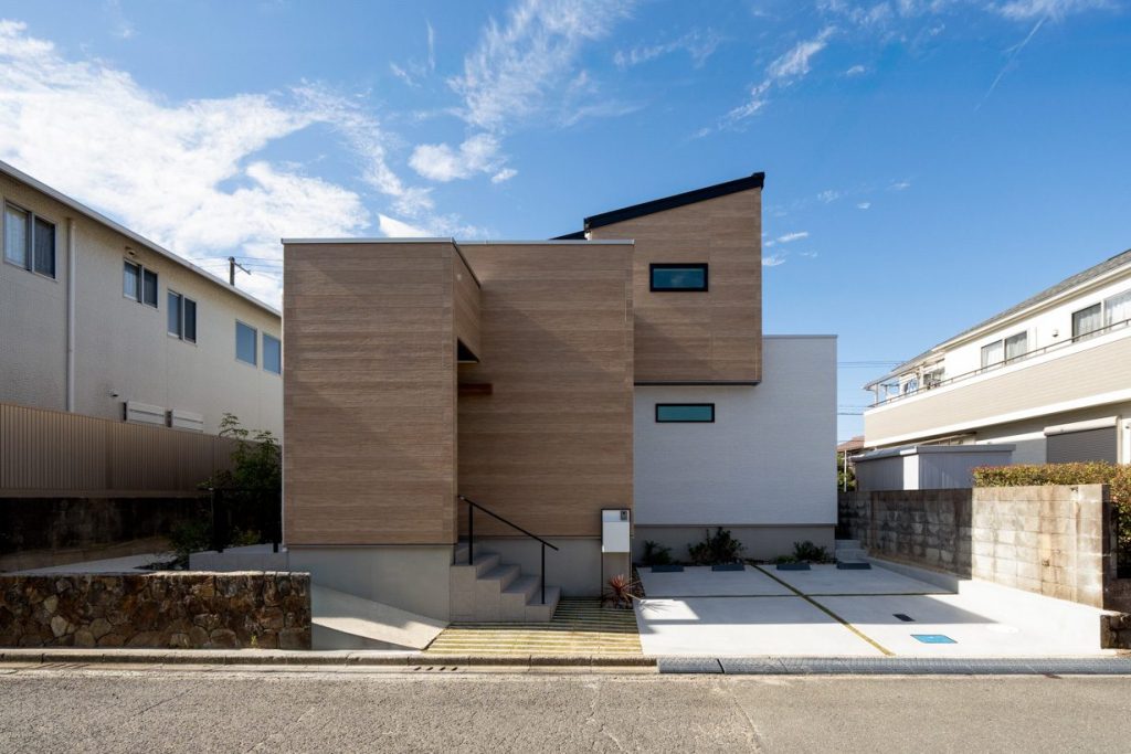 グレーの瓦屋根と白の外壁をベースに、木目調のサイディングをアクセントとして採用しています。