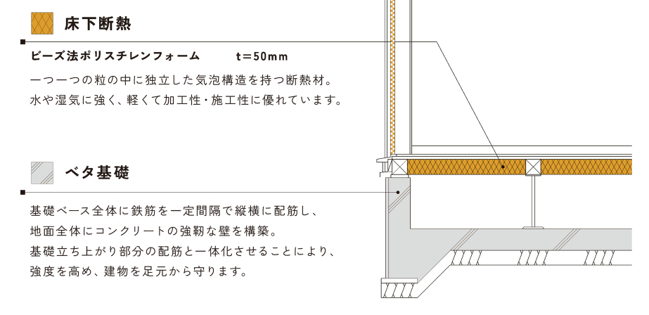 窓の断熱性能を高めて、外気の影響をさらに受けにくくなり、冷暖房効率の向上が期待できます。 - 床断熱の厚みをプラス