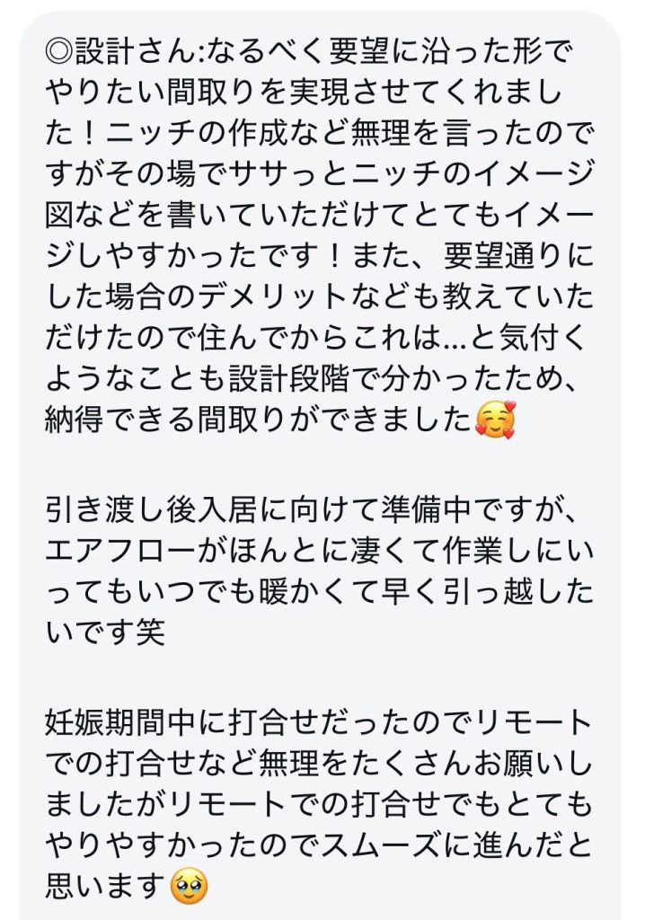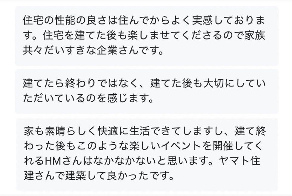 ヤマト住建で家を建てたフォロワーさんの声2つ目は、「建てた後も施主を大切にしてくれる」です。