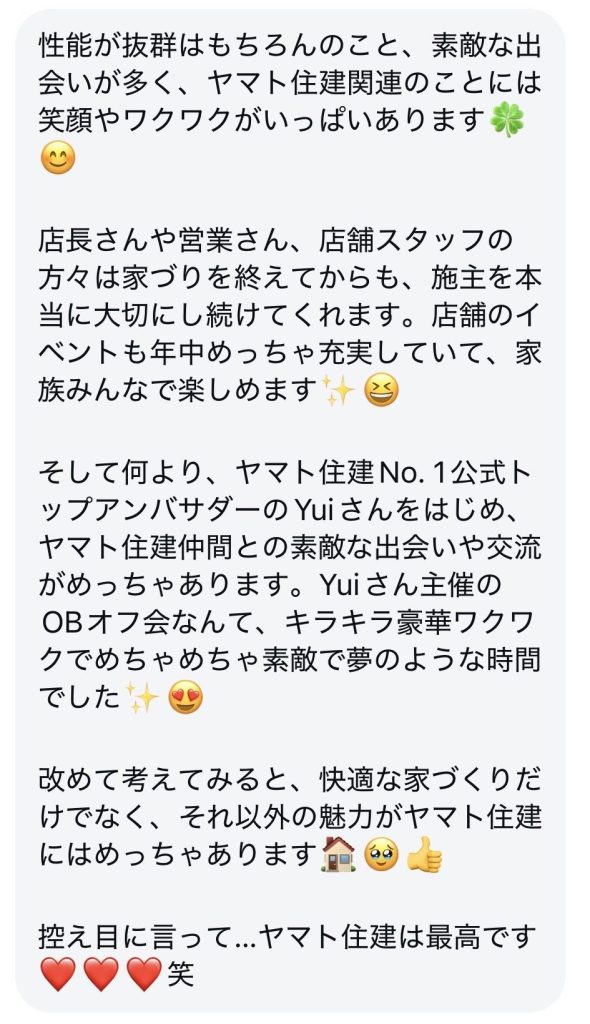 ここでは、ヤマト住建公式トップアンバサダーYuiのフォロワーさんからいただいた声を元に、評判・口コミを紹介します。
